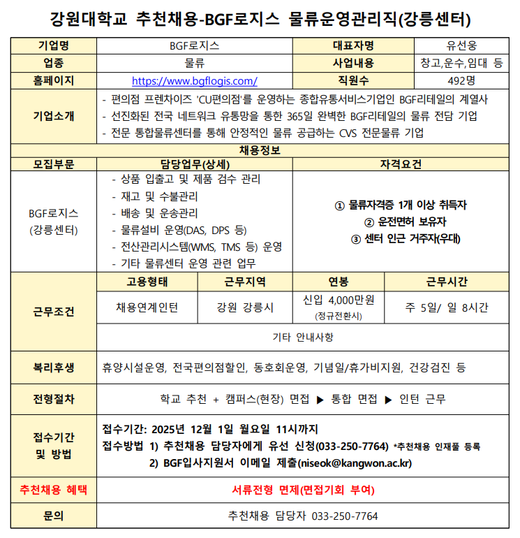 BGF로지스에서 강원대학교 졸업생 및 졸업예정자를 대상으로 추천채용을 진행합니다. 추천채용 지원자에게는 면접기회가 주어집니다.